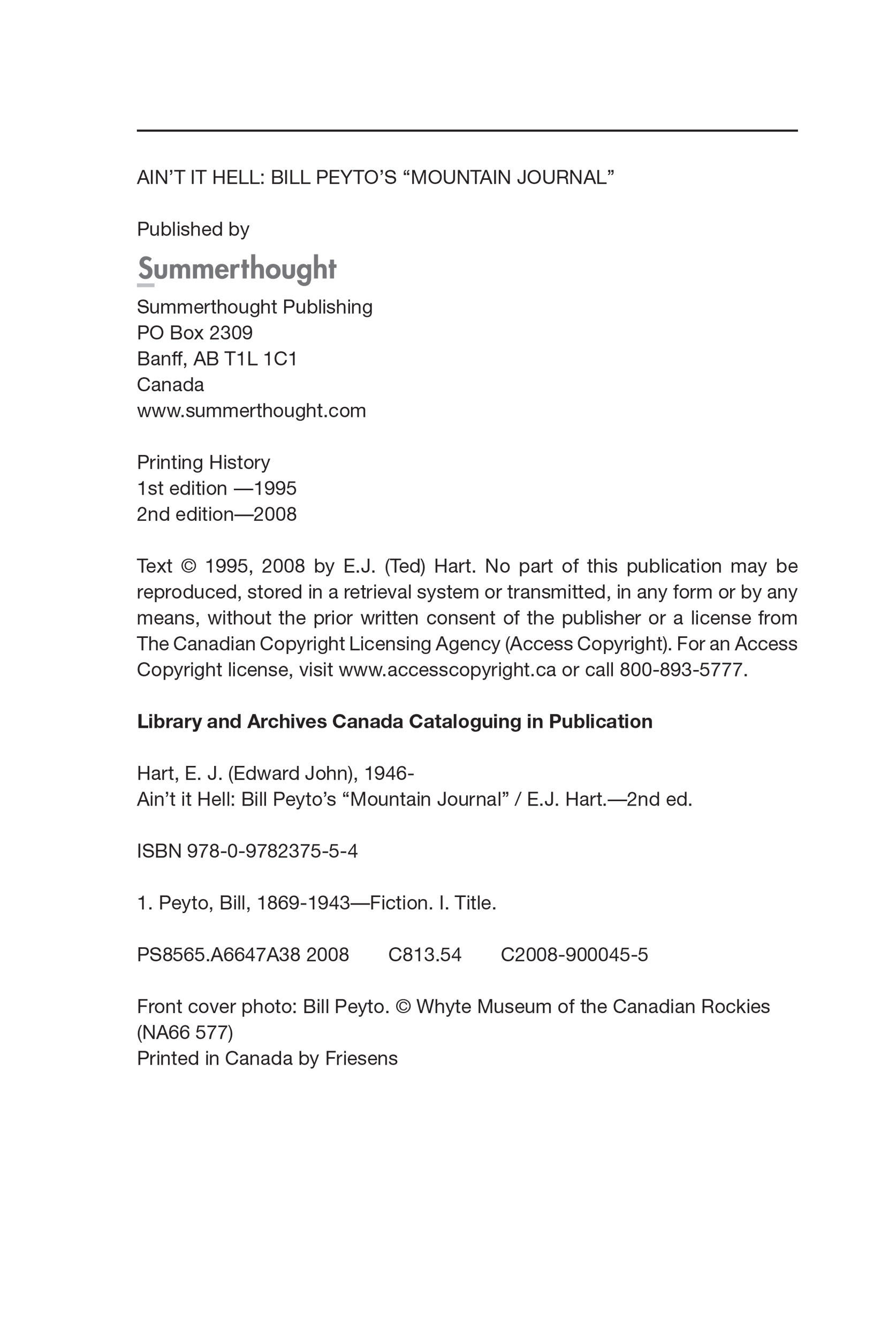 E. J. (TED) HART’s life and career have been dominated by the history of Banff. Born and educated in Edmonton, Alberta, Ted graduated with a Masters in Western Canadian History at the University of Alberta in 1971. The following year he was hired by the late Maryalice Stewart to work in the archives at what was then known as the Peter Whyte Foundation, beginning what would be a 40-year-long career involved with the cultural history of Banff and the Canadian Rockies. Encouraged by noted mountain poet Jon Whyte, Ted published his first book on Canadian Rockies history, Diamond Hitch, the Early Outfitters and Guides of Banff and Jasper, in 1975. In 1976, Hart took over as the head of the Whyte Foundation, a position that evolved into the Director of the Whyte Museum of the Canadian Rockies and that he held until 2008. During this period Hart authored 12 books relating to Banff and the Rockies, including his award-winning The Selling of Canada: The CPR and the Beginnings of Canadian Tourism; Jimmy Simpson, Legend of the Rockies and a work of fiction, Ain’t it Hell: Bill Peyto’s “Mountain Journal.” Between 2008 and 2010 Ted continued to oversee the archives at the Whyte Museum and work on a major biography of Dominion Parks Commissioner J. B. Harkin, published in 2010 as J. B. Harkin, Father of Canada’s National Parks. Ted retired from the Whyte Museum in 2010 and now lives with his wife, Pat, south of Calgary in the foothills town of Okotoks.