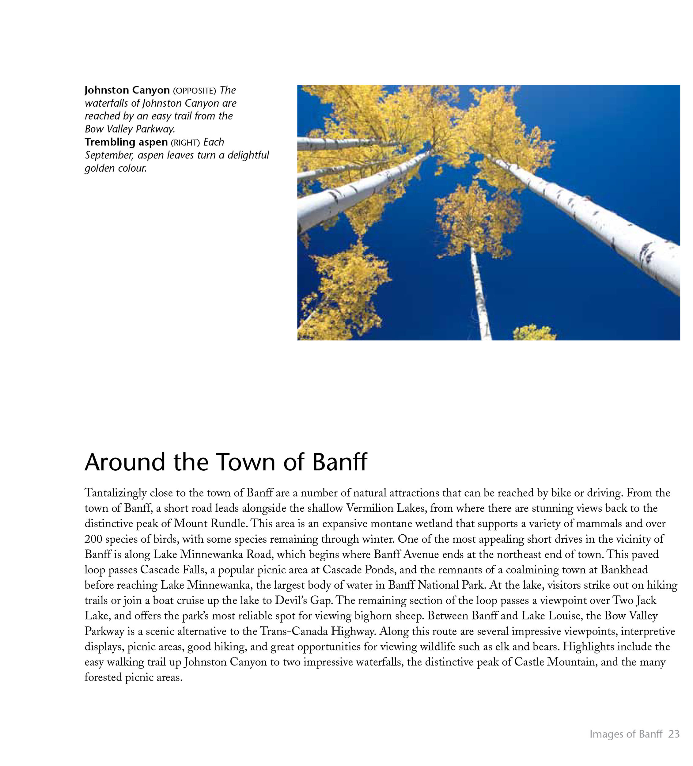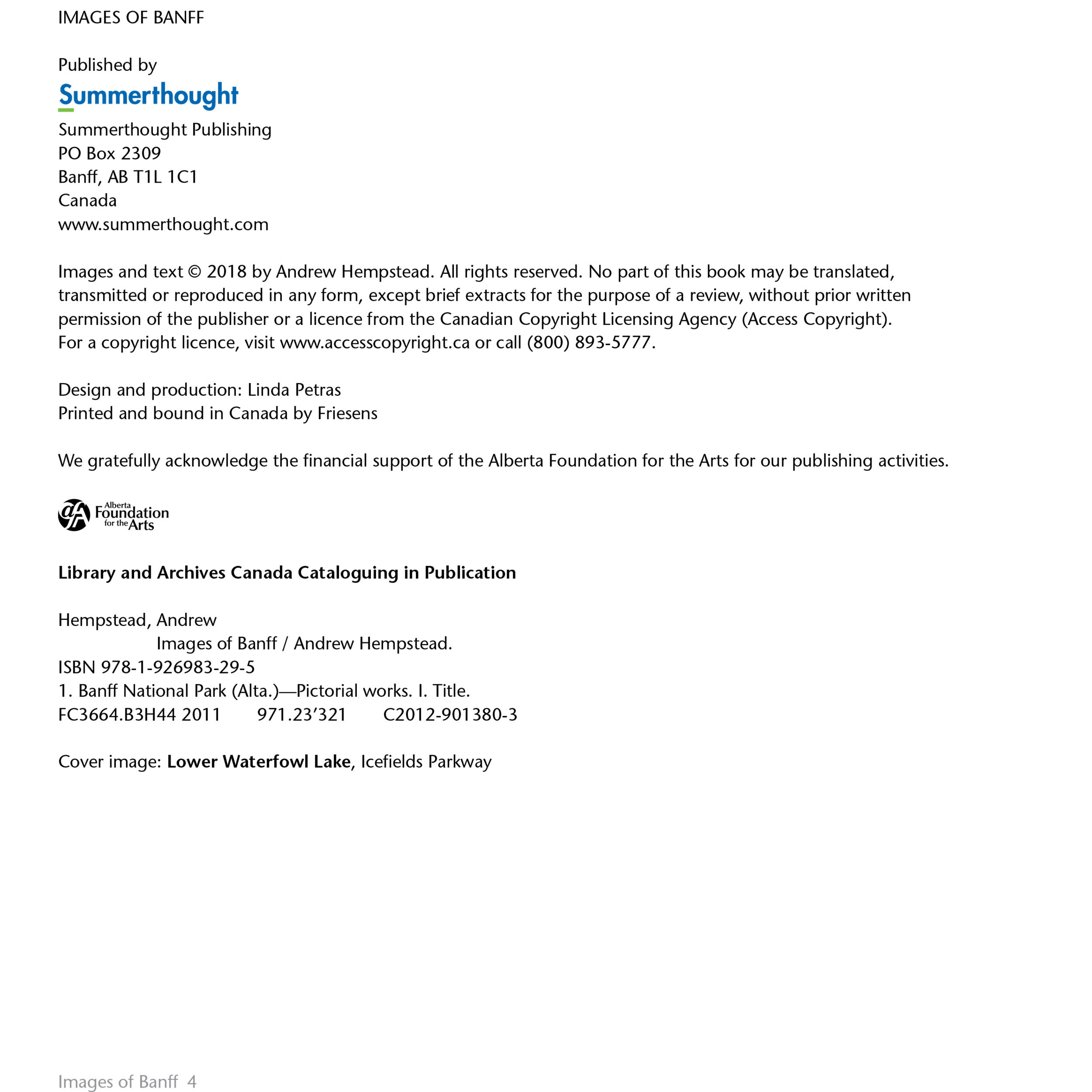 Images of Banff includes images from all parts of Banff National Park and through all four seasons—from famously photogenic lakes to local children playing hockey, and from sweeping landscapes to intimate portraits of local wildlife. The book is divided into four chapters and each image is accompanied by an informative caption.